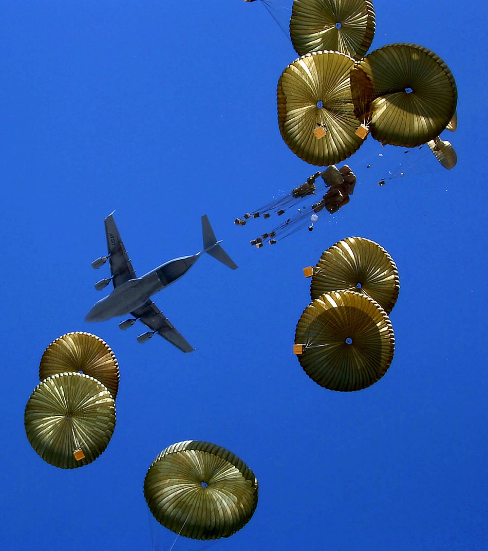 A C-17 Globemaster III aircrew executes an airdrop mission over Afghanistan. In 2008, Air Force aircraft dropped more than 15 million pounds of supplies in Iraq and Afghanistan. (U.S. Army photo/Spc. Micah E. Clare)
