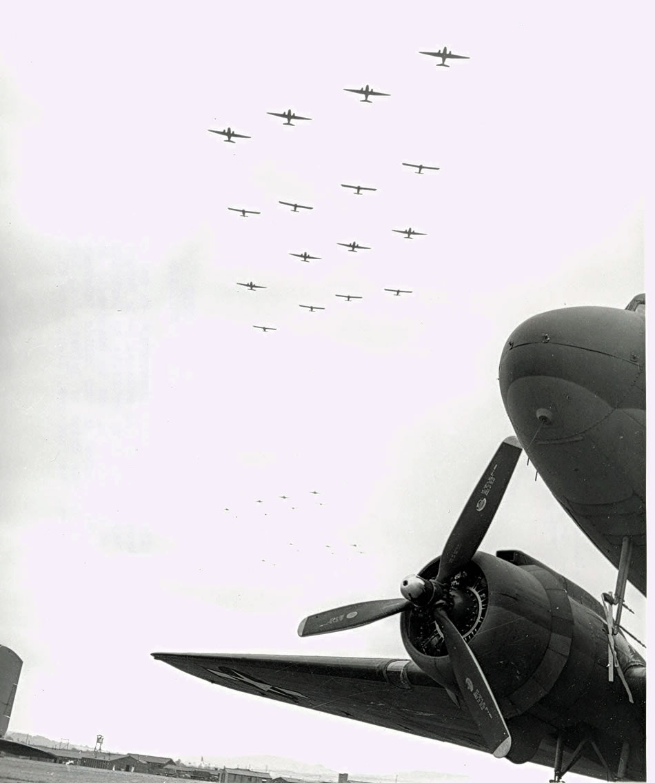 C-47 transport planes tow gliders loaded with airborne troops and equipment to be used in the invasion of Holland ( WW2 Signal Corps Photograph collection).
