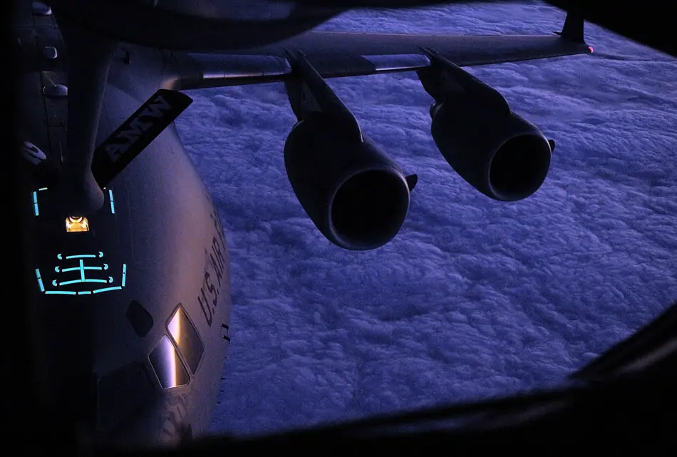 A C-17A Globemaster III aircraft receives fuel from a KC-135R Stratotanker over the Pacific Ocean July 30. The aircraft are from the 452nd Air Mobility Wing out of March Air Reserve Base, Calif. (U.S. Air Force photo/Master Sgt. Rick Sforza)