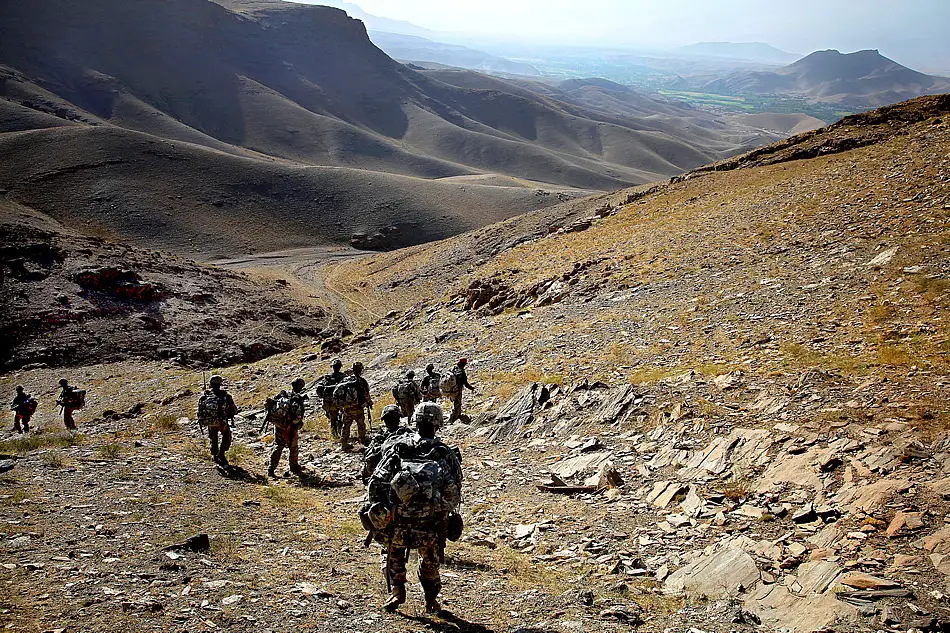 U.S. Army soldiers travel down a mountain during a dismounted patrol next to the Tangi Valley in the Wardak province, Afghanistan, Aug. 30, 2009. U.S. Army photo by Sgt. Teddy Wade