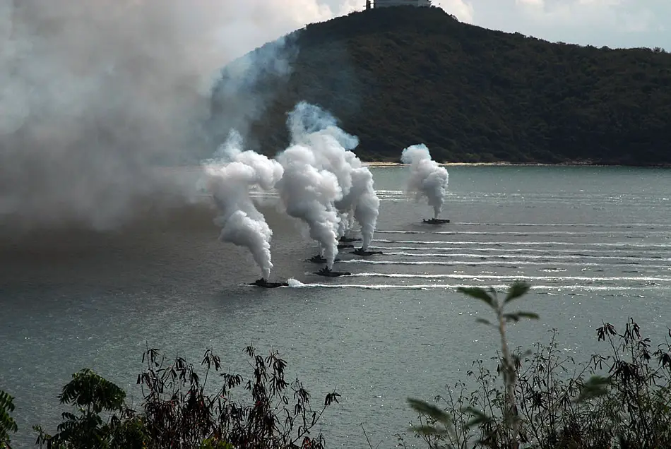 HAT YAO, Thailand (Feb. 4, 2010) Republic of Korea amphibious assault vehicles release a smoke screen before hitting the beach during a Cobra Gold 2010 amphibious landing demonstration at Hat Yao Beach during. Cobra Gold is a joint and coalition multinational exercise hosted annually by the Kingdom of Thailand. (US Navy photo by Lt. Cmdr. Denver Applehans)