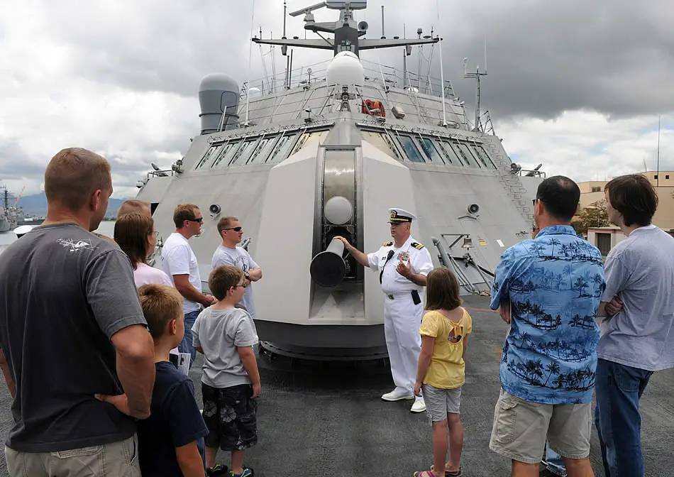 Lt. Cmdr. Earl Timmons assigned to the littoral combat ship USS Freedom explains the specifics of Freedom's Mk-110 57 mm gun to visitors during a public tour of the ship at Joint Base Pearl Harbor-Hickam. Freedom is participating in Rim of the Pacific 2010, the worlds largest international maritime exercise. Photo by Lt. Ed Early