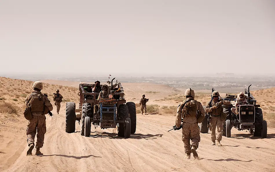 Marines from Headquarters Company, 3rd Battalion, 3rd Marine Regiment, conduct a re-supply during Operation Big Wave in Khanagawr, Afghanistan, Aug. 18, 2010. Local farmers assisted the Marines by driving the supplies in their tractors, saving the men from having to carry them a mile and a half in triple-digit heat. The operation was conducted to disrupt the enemy from using supply lines to bring weapons and fighters into Nawa. Photo by Sgt. Mark Fayloga