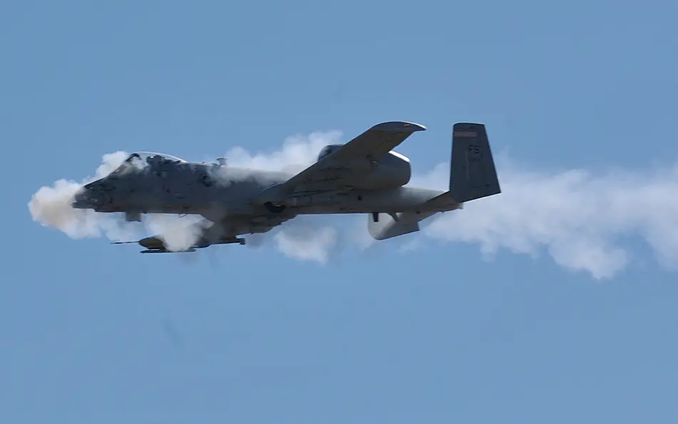 An A-10C Thunderbolt II from the Arkansas Air National Guard's 188th Fighter Wing fires its seven-barrel Gatling gun at a ground target Oct. 14, 2010, during the 2010 Hawgsmoke competition in Boise, Idaho. (U.S. Air Force photo/Tech. Sgt. John Orrell)