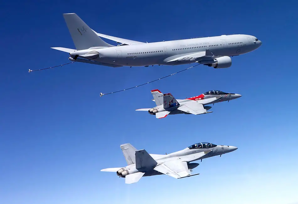 TIMOR SEA (July 9, 2015) Two F/A-18F Super Hornets assigned to the Diamondbacks of Strike Fighter Squadron (VFA) 102 complete a refueling from a Royal Australian Air Force KC-30A during Talisman Sabre 2015. Talisman Sabre is a biennial exercise that provides an invaluable opportunity for nearly 30,000 U.S. and Australian defense forces to conduct operations in a combined, joint and interagency environment that will increase both countries' ability to plan and execute a full range of operations from combat missions to humanitarian assistance efforts. (U.S. Navy photo by Lt. David Robinson)