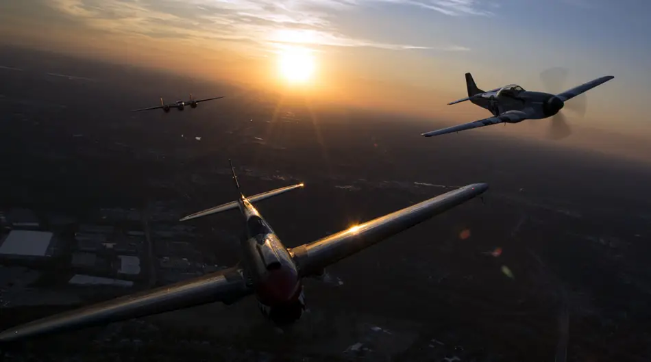 A P-40 Warhawk, P-51 Mustang and a B-25 Mitchell fly over Joint Base Anacostia-Bolling, Washington, during a Military Tattoo on base Sept. 16, 2015. The “Warbirds flight”, which also consisted of two B-25 Mitchells and two P-40 Warhawks. (U.S. Air Force photo by Airman 1st Class Philip Bryant/Released)