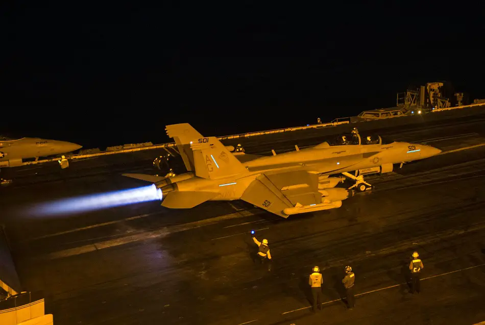 ATLANTIC OCEAN (Sept. 28, 2015) An EA-18G Growler assigned to the Patriots of Electronic Attack Squadron (VAQ) 140 launches from the flight deck of the aircraft carrier USS Harry S. Truman (CVN 75). The Harry S. Truman Carrier Strike Group is underway participating in a composite training unit exercise in preparation for a future deployment. (U.S. Navy photo by Mass Communication Specialist 3rd Class J. R. Pacheco)