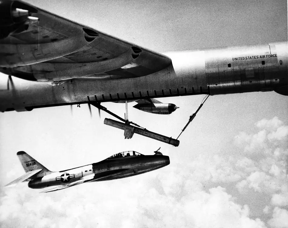 The YRF-84F flying underneath its B-36 carrier aircraft. FICON modifications included installing a hook in front of the cockpit and turning down the horizontal tail so it could partially fit into the B-36 bomb bay. (U.S. Air Force photo)