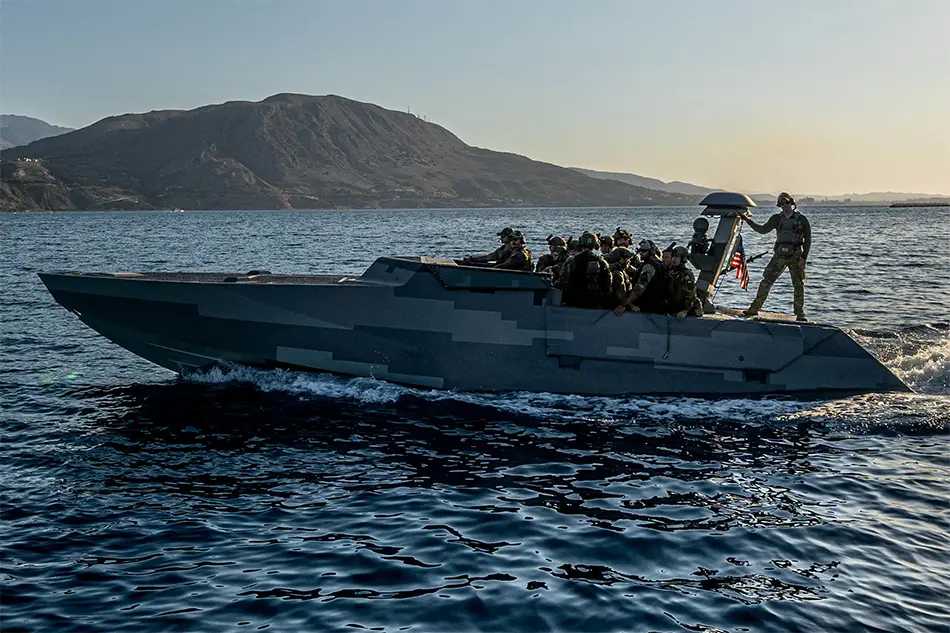 U.S. Naval Special Warfare Combatant-Craft Crewmen with Special Boat Team. TWELVE, U.S. Naval Special Warfare Group FOUR operate a combat craft assault while carrying Swedish Marines with 4th Marine Regiment, Swedish Amphibious Corps during exercise TYR 22 at the NATO Maritime Interdiction Operational Training Centre in Souda bay, Greece, July 21, 2022. TYR 22 is a maritime interdiction operations exercise held at NMIOTC, bringing together Swedish Marines, U.S. Marines, U.S. Navy Special warfare combatant-craft crewmen to improve US and NATO Partner operational capacity, capability, and interoperability. U.S. Marine Corps photo by Sgt. William