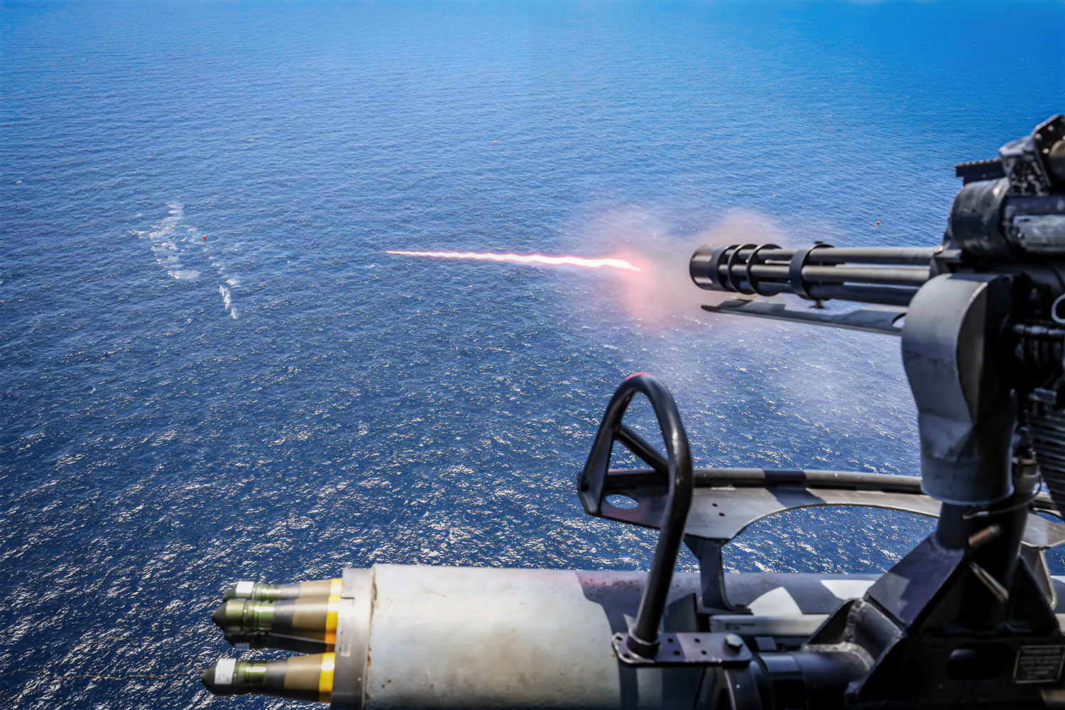 CARIBBEAN SEA (Sept. 22, 2025) A UH-1Y Huey, assigned to Marine Medium Tiltrotor Squadron (VMM) 263 (Reinforced), fires a GAU-17 Gatling gun during a live-fire exercise. As part of their assigned responsibilities to ensure global reach and readiness, the services routinely provide U.S. Southern Command with resources, capabilities, and personnel to support its mission, War Department-directed operations, and the President’s priorities. (U.S. Navy photo by Mass Communication Specialist Seaman Andrew Eggert)