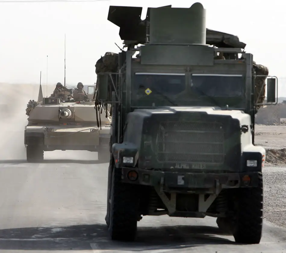 An M-1A1 Main Battle Tank crew from Company D, 2nd Tank Battalion follows in trace of a seven-ton truck filled with Marines from Company E, 2nd Battalion, 6th Marine Regiment during Operation Mesopotamia II. The operation combined a tank platoon with an reinforced infantry squad to distrupt insurgent activity in Regimental Combat Team 5's Northern Regimental Security Area.Photo by: Gunnery Sgt. Mark Oliva