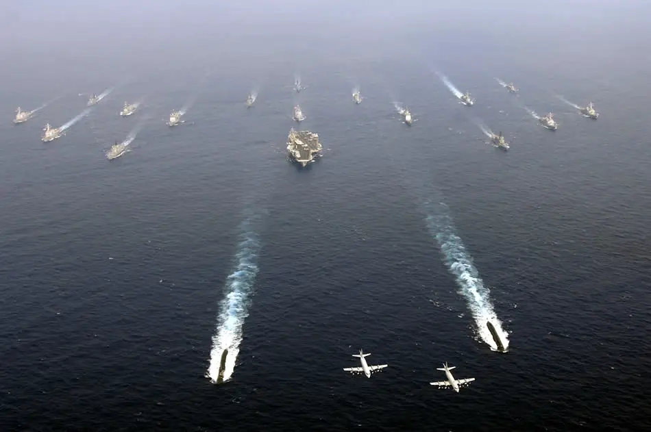 PHILIPPINE SEA (Nov. 16, 2007) Two Japan Maritime Self-Defense Force (JMSDF) P-3C Orion patrol aircraft fly over a group of 19 American and Japanese naval ships at the end of ANNUALEX 19G, the maritime component of the U.S.-Japan exercise Keen Sword '08. The exercise was designed to increase interoperability between the United States and JMSDF and increase their ability to effectively and mutually respond to a regional crisis situation. U.S. Navy photo by Mass Communication Specialist Seaman Kyle D. Gahlau