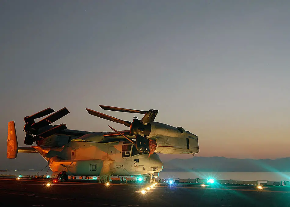 STRAITS OF TIRAN (Oct. 3, 2007) - Lights on the flight deck of the multipurpose amphibious assault ship USS Waspx (LHD 1) illuminate a MV-22 Osprey attached to Marine Medium Tilt-rotor Squadron (VMM) 263 as it transits the Straits of Tiran. Waspx is on a surge deployment bringing the Osprey on its first combat deployment to the Middle East. U.S. Navy photo by Mass Communication Specialist 2nd Class Zachary L. Borden