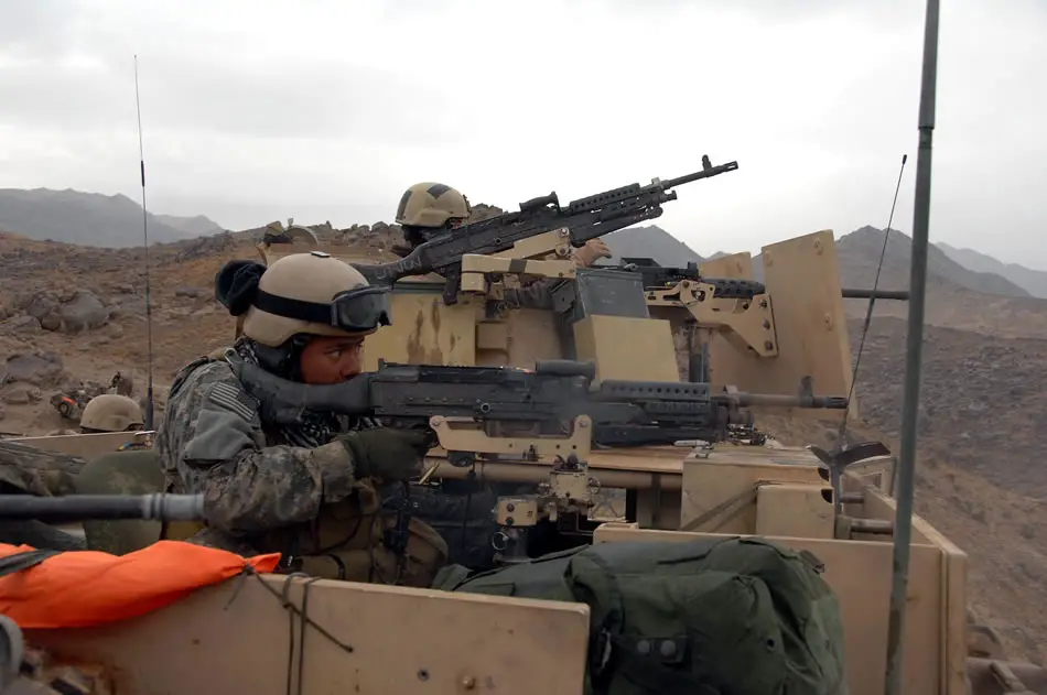 Afghan national army and coalition forces return fire during an engagement with Taliban in Farah province, Afghanistan, Dec. 5. The operation was conducted to disrupt Taliban activity in Farah province and surrounding areas. Photo by Sgt. Michael ZukView