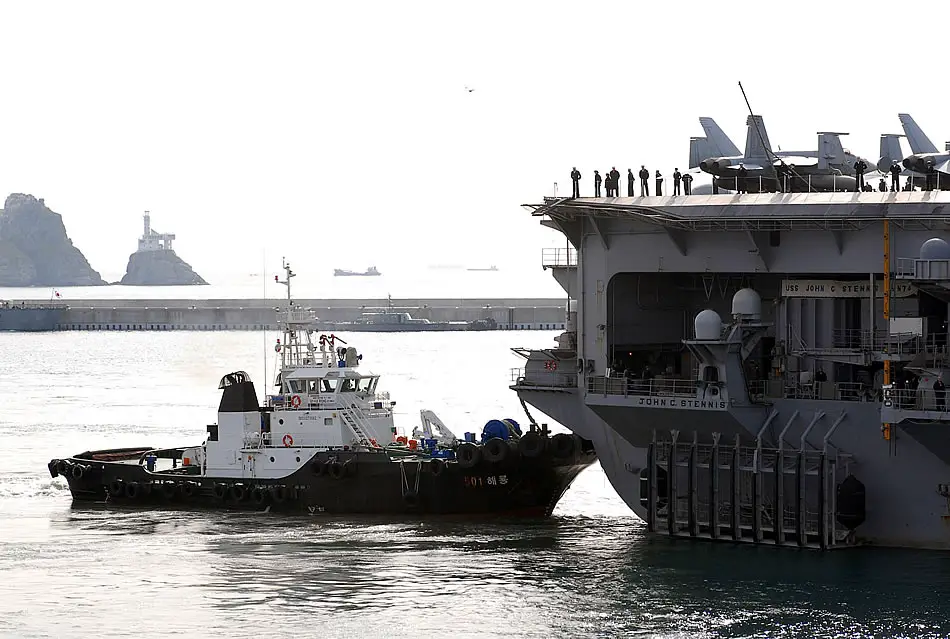 BUSAN, Republic of Korea (March 11, 2009) Sailors man the rails as harbor tugs maneuver the aircraft carrier USS John S. Stennis (CVN 74) into Busan. John C. Stennis is in Korean to participate in Key Resolve 2009, a combined exercise with the Republic of Korea. John C. Stennis is on a scheduled six-month deployment to the western Pacific Ocean. U.S. Navy photo by Mass Communication Specialist Matthew Schwarz