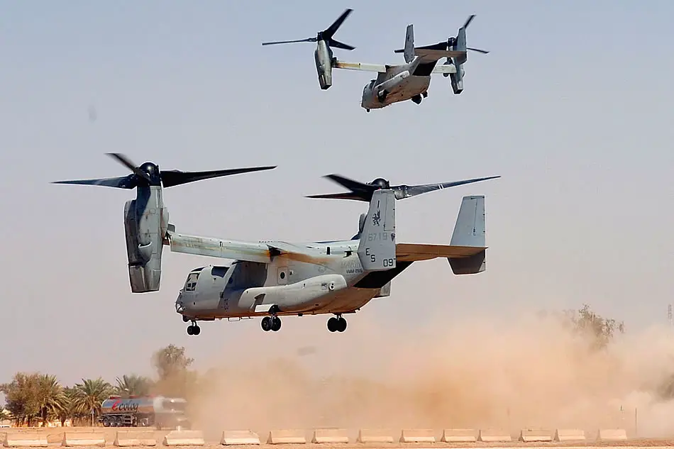Two U.S. Marine Corps MV-22 B Osprey tilt-rotor aircraft take off from Camp Liberty Command Pad, Iraq, March 19, 2009. When it comes to how it flies, the Osprey combines the best of both worlds with the ability to take off and land like a helicopter and the added feature of flying through the air like a plane. U.S. Army photo by Staff Sgt. Jon Cupp