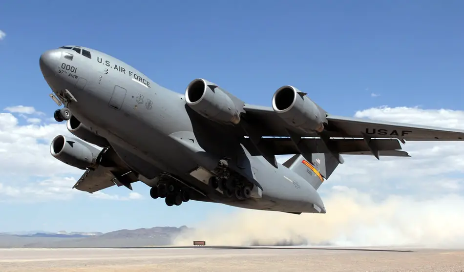 A C-17 Globemaster III assigned to the 97th Air Mobility Wing at Altus Air Force Base, Okla., takes off from the Tonopah runway May 20 near Nellis AFB, Nev., while participating in the Mobility Air Forces Exercise. Approximately 12 U.S. Air Force bases participate in the exercise twice a year, testing the crew ability of C-17 Globemaster IIIs and C-130s to join together in formation at a specific time and location to drop a brigade-size force anywhere in the world. (U.S. Air Force photo/Airman 1st Class Brett Clashman)