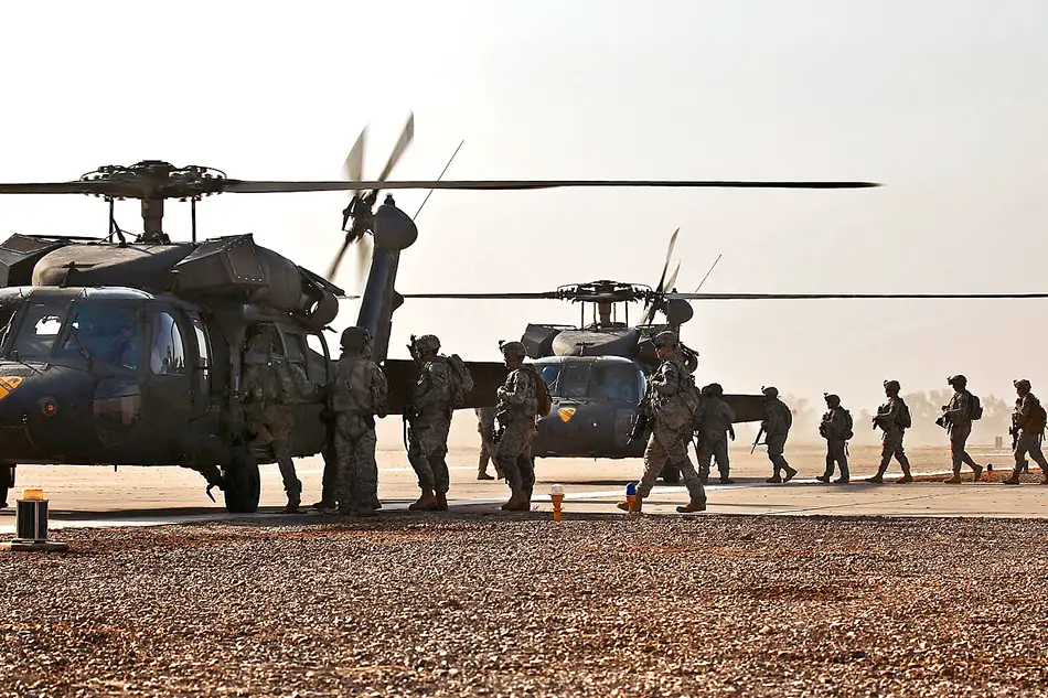 U.S. Army soldiers load into two Black Hawk helicopters as they prepare to fly to a nearby town and conduct a presence patrol in Taji, Iraq, Sept. 18, 2009. The soldiers are assigned to the 1st Cavalry Division's Company F, 3rd Battalion, 227th Aviation Regiment, 1st Air Cavalry Brigade. U.S. Army photo by Sgt. Travis Zielinski