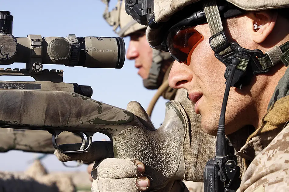 U.S. Marine Lance Cpl. Keith B. Lawson and Lance Cpl. Spence G. Press work together to identify targets as Taliban fighters approach from Marja toward their position at the "Five Points" intersection, Feb. 9, 2010. U.S. Marine Corps photo by Sgt. Brian Tuthill