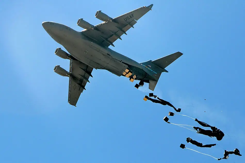 A U.S. Air Force C-17 Globemaster III aircraft drops cargo over Forward Operating Base Baylough, Afghanistan, June 10, 2010. The cargo drop was to support Company D, 1st Battalion, 4th Infantry Regiment. U.S. Army photo by Staff Sgt. William Tremblay