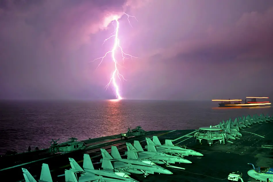 Lighting flashes as the aircraft carrier USS Abraham Lincoln transits in the Straight of Malacca, Oct. 8, 2010. U.S. Navy photo by Petty Officer 3rd Class Colby K. Neal