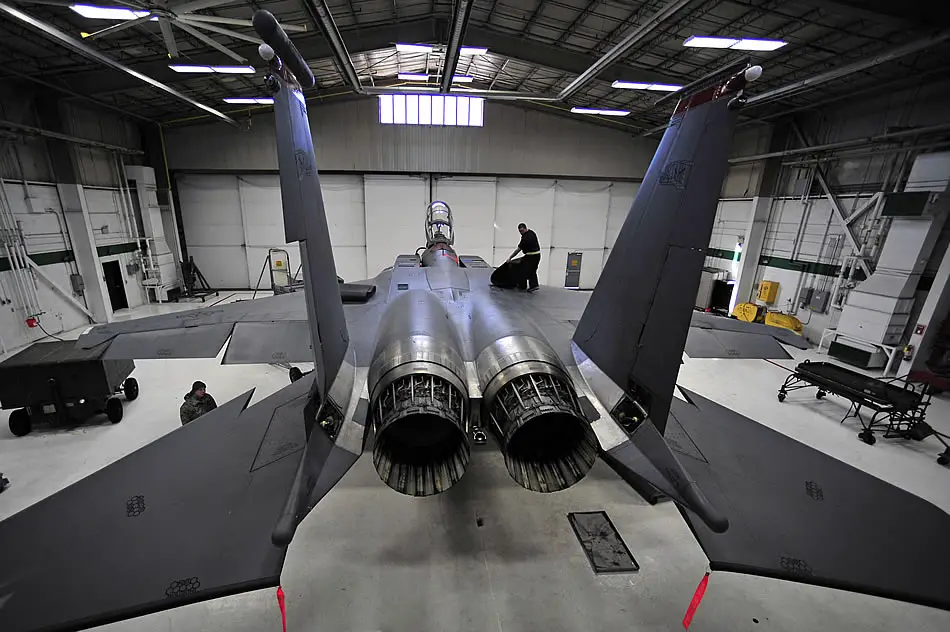 Tech. Sgt. Shawn Merchant, a crew chief with the 4th Aircraft Maintenance Squadron, removes foreign object inspection mats from an F-15E Strike Eagle Dec. 15, 2010, at Seymour Johnson Air Force Base, N.C. The aircraft is assigned to the 4th Fighter Wing. (U.S. Air Force photo/Tech. Sgt. Tony R. Tolley)