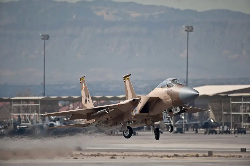A pilot from the 65th Aggressor Squadron takes off in an F-15 Eagle Feb. 2, 2011, for a training mission during exercise Red Flag 11-2 at Nellis Air Force Base, Nev. (U.S. Air Force photo/Tech Sgt. Michael R. Holzworth)