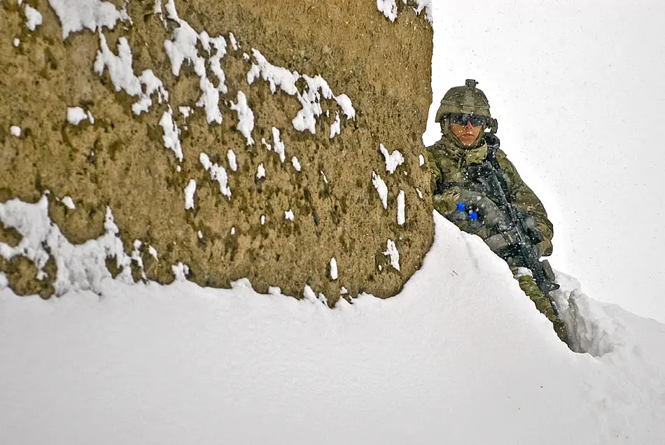 Duluth, Minn., native U.S. Army Spc. William E. Simmons, a rifleman assigned to Company D, 2nd Battalion, 30th Infantry Regiment, 4th Brigade Combat Team, 10th Mountain Division, Task Force Storm provides security during a patrol in Kharwar District, Feb. 12. Photo by Sgt. Cooper Cash