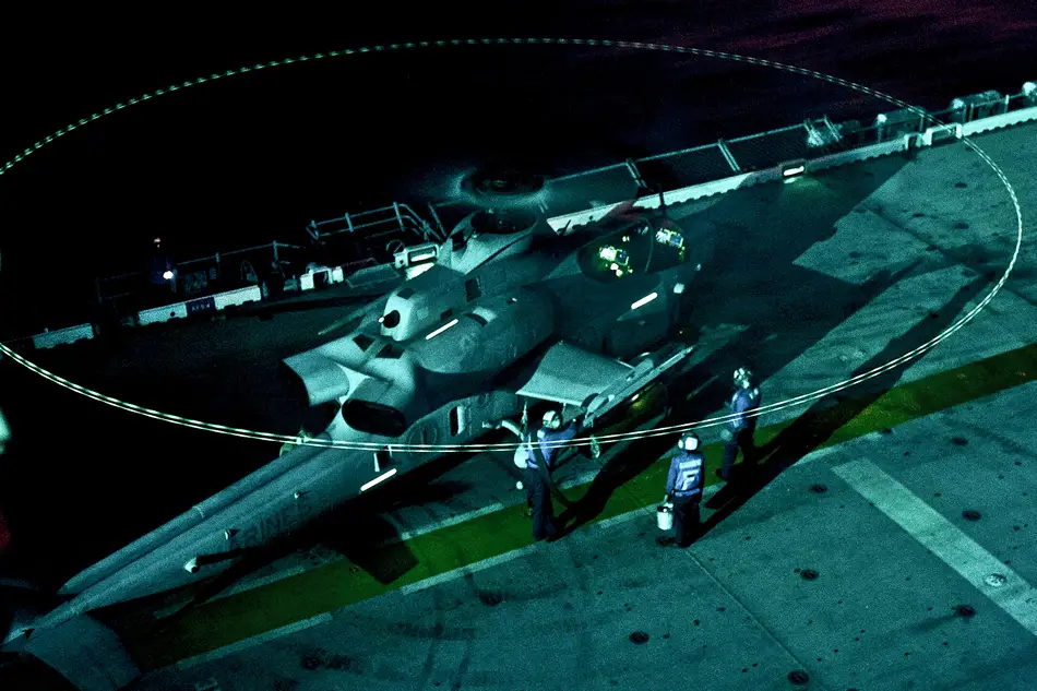U.S. sailors conduct a hot refueling of a AH-1 Cobra attack helicopter during night flight operations aboard the USS Makin Island in the Indian Ocean, Dec. 30, 2011. The sailors are aviation boatswains mates, and the Cobra crew is assigned to the Red Dragons of Marine Medium Helicopter Squadron 268 Reinforced. Makin Island is on its maiden deployment and conducting operations in the U.S. 7th Fleet area of responsibility. U.S. Navy photo by Petty Officer 2nd Class Alan Gragg
