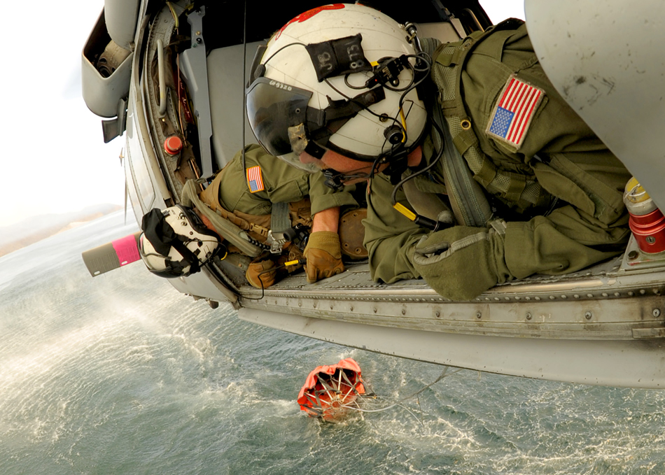 NAVAL BASE VENTURA COUNTY POINT MUGU, Calif. (May 3, 2013)Chief Naval Aircrewman Jay Okonek, left, and Naval Aircrewman 1st Class Jason Blase, both assigned to the "Merlins" of Helicopter Sea Combat Squadron (HSC) 3, help guide pilots as they fill a 360-gallon capacity precision helicopter firefighting Bambi bucket to help extinguish fires near Naval Base Ventura County (NBVC) Point Mugu's base housing. Three helicopters from the San Diego-based HSC 3 and HSC 21 are providing firefighting support in response to wildfires at NBVC. U.S. Navy photo by Mass Communication Specialist 1st Class Chris Fahey