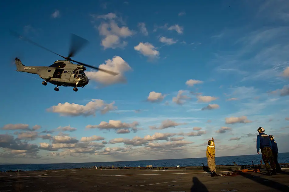 PACIFIC OCEAN (June 28, 2013) U.S. Navy Boatswain's Mate 2nd Class Cassandra Collier signals to a French Armee De Terre SA 380 Puma helicopter as it takes off from the amphibious dock landing ship USS Pearl Harbor (LSD 52). Pearl Harbor, underway for Pacific Partnership 2013, conducted flight deck qualifications with the helicopter while departing Noumea, New Caledonia. A French helicopter detachment will be joining Pacific Partnership in the Solomon Islands. (U.S. Navy photo by Mass Communication Specialist 2nd Class Carlos M. Vazquez II)