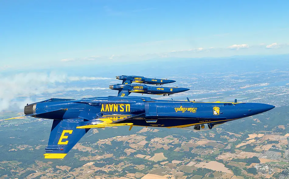 HILLSBORO, Ore. (July 17, 2015) The U.S. Navy flight demonstration squadron, the Blue Angels, perform the Line Abreast Loop maneuver during a practice demonstration at the Oregon International Air Show. The Blue Angels are scheduled to perform 68 demonstrations at 35 locations across the U.S. in 2015. (U.S. Navy photos by Mass Communication Specialist 2nd Class Andrea Perez)