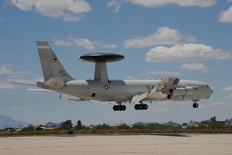 An E-3 Sentry AWACS from Tinker Air Force Base, Okla., prepares to land May 16, 2015. AWACS have the capability to detect enemy as well as friendly aircraft at great distances using an interrogation system. A program office from Hanscom AFB, Mass., is modernizing the aircraft by updating the current interrogation system. The first installation was completed in April. (U.S. Air Force photo/Senior Airman Betty R. Chevalier)