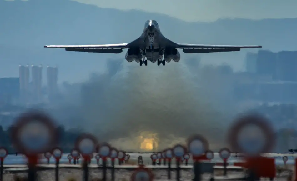 A B-1B Lancer assigned to the 28th Bomb Wing at Ellsworth Air Force Base, S.D., takes off on the first day of Red Flag 16-2 Feb. 29, 2016, at Nellis AFB, Nev. (U.S. Air Force photo/Airman First Class Keven Tanenbaum)