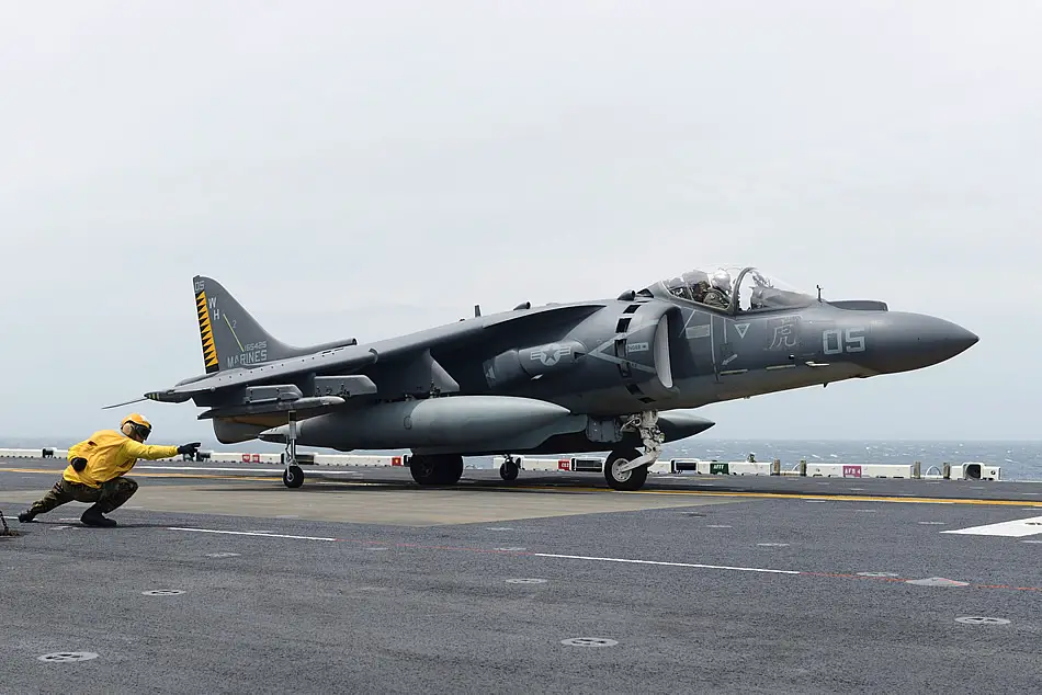 ATLANTIC OCEAN (April 15, 2016) Aviation Boatswain's Mate (Handling) 3rd Class Pedro Saldana launches an AV-8B Harrier aircraft attached to Marine Attack Squadron 542 (VMA-542) off the flight deck of the amphibious assault ship USS Bataan (LHD 5). Bataan is currently underway conducting routine qualifications in preparation for her future deployment. (U.S. Navy photo by Mass Communication Specialist 3rd Class Raymond Minami)