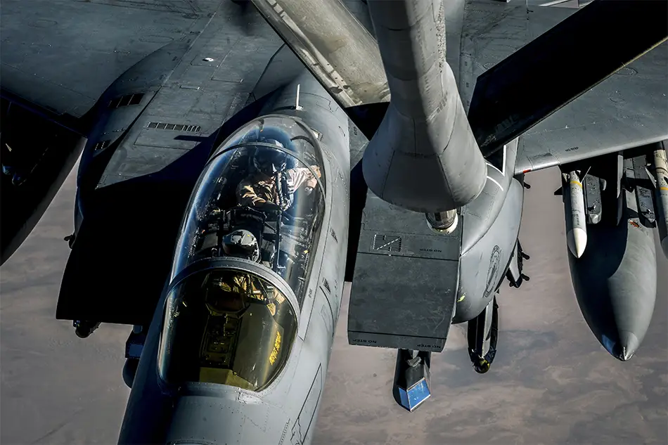 An Air Force F-15E Strike Eagle prepares to receive fuel from a 340th Expeditionary Air Refueling Squadron KC-135 Stratotanker to support Operation Inherent Resolve from an undisclosed location, Oct. 6, 2017. The F-15E Strike Eagle is a dual-role fighter designed to perform air-to-air and air-to-ground missions. Air Force photo by Staff Sgt. Michael Battles