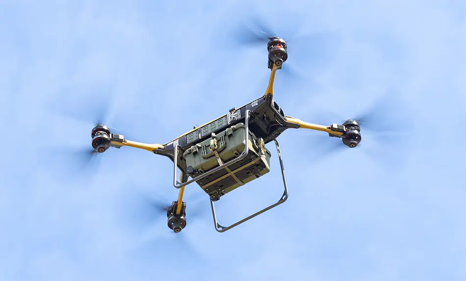 APR 11, 2023The Tactical Resupply Unmanned Aircraft Systemflies during a demonstration at DZ Cockatoo on Marine Corps Base Quantico, Virginia, March 29, 2023. Combat Development and Integration demonstrated the TRUAS, programming the Unmanned Logistics Systems-Air to carry a payload over a short distance, drop it at a specified location in the landing zone and return to its staring point. The TRUAS has a 9-mile range and maximum payload of 150 pounds, which is sufficient to fly in ammunition, food, medical supplies, and batteries, among other supplies. This small system only requires two Marines to operate and will be a game-changing capability for our distributed forces. Fielding this capability is a critical step in setting conditions for the development of the ULS-A Medium system, which is the required capability for large-scale tactical distribution in a contested space. photo by Lance Cpl. Kayla M. LeClaire