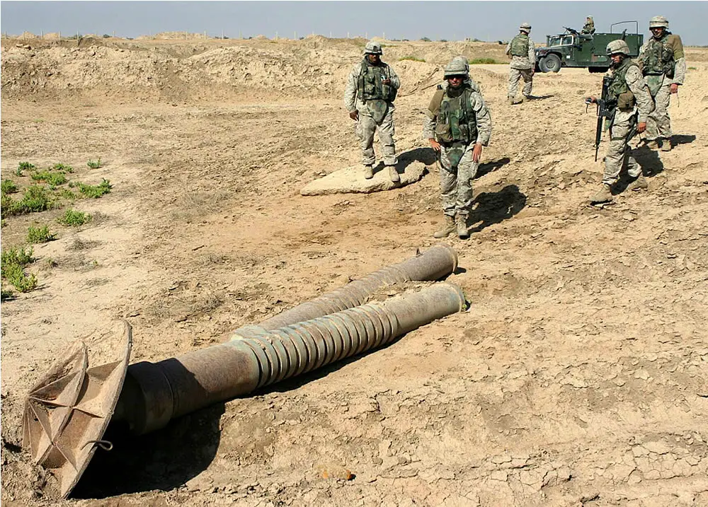 Marines from the 24th Marine Expeditionary Unit find two 160 mm mortar tubes while patrolling outside Forward Operating Base Iskandariyah, Iraq, Sept. 26. During the patrol, the Marines from Bravo Company, Battalion Landing Team 1st Battalion, 2nd Marines, discovered a weapons cache. The 24th MEU is currently conducting security and stability operations in Northern Babil Province.