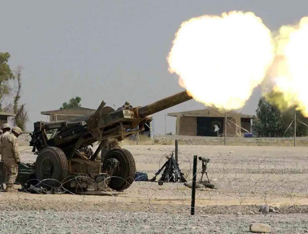 Soldiers from the 37th Field Artillery Regiment, 2nd Infantry Division, practice firing the M198 howitzer at Forward Operating Base Endurance, Iraq.