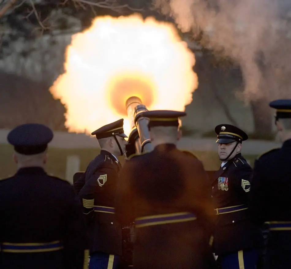 Soldiers from 1st Battalion, 119th Field Artillery Regiment, Michigan Army National Guard fire a 21-gun salute honoring former President Gerald R. Ford at the Gerald R. Ford Presidential Museum in Grand Rapids, Mich., Jan. 3. Photo by Tech. Sgt. Cecilio M. Ricardo Jr.