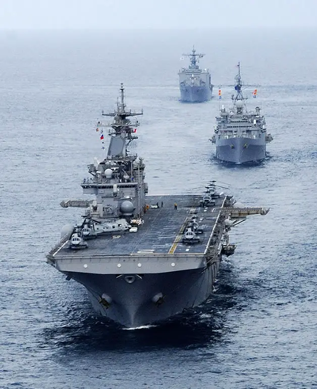 ANDAMAN SEA (May 23, 2008) The amphibious ship USS Essex (LHD 2) and the Essex Amphibious Ready Group (ARG) steam in formation in the Andaman Sea. The Essex ARG is standing by in international waters off the coast of Burma in support of Joint Task Force Caring Response, a humanitarian assistance operation developed in the wake of Cyclone Nargis. U.S. Navy photo by Chief Mass Communication Specialist Ty Swartz