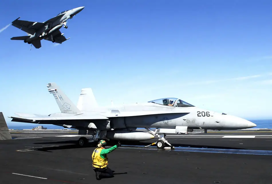 PACIFIC OCEAN (June 19, 2008) An F/A-18C Hornet assigned to the "Sharpshooters" of Marine Fighter Training Squadron (VMFAT) 101 prepares to launch from the Nimitz-class aircraft carrier USS John C. Stennis (CVN 74) as an F/A-18F Super Hornet assigned to the "Flying Eagles" of Strike Fighter Squadron (VFA) 122 flies over the landing area. Stennis and multiple embarked fleet replacement squadrons are conducting Fleet Replacement Squadron Carrier Qualifications (FRSCQ) off the coast of Southern California. FRSCQ's are conducted to qualify naval aviators in day and night carrier operations in the aircraft they will fly during their aviation career. U.S. Navy photo by Mass Communication Specialist 2nd Class Elliott Fabrizio