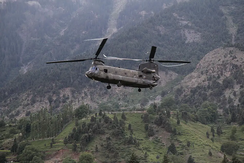 A U.S. Army Chinook helicopter takes off from the town of Kalam fully loaded with people to be evacuated from the flood damaged area, Khyber Pakhtunkhwa province (formerly North West Frontier province), Pakistan, Aug. 9, 2010. Photo by Staff Sgt. Horace Murray