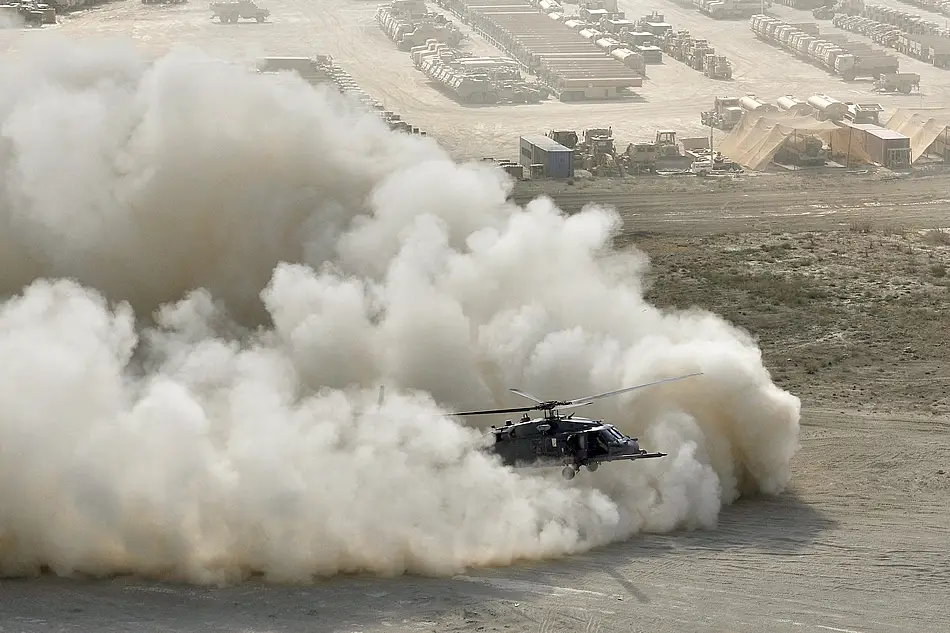 Airmen flying a HH-60G Pave Hawk during a pararescue training mission perform a brown-out landing during a training mission at Bagram Airfield, Afghanistan, Sept. 24, 2010. The pararescuemen are assigned to the 33rd Expeditionary Rescue Squadron. (U.S. Air Force photo/Staff Sgt. Christopher Boitz)