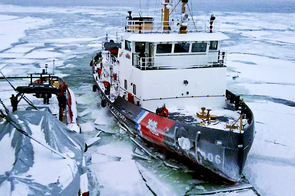 Crewmembers aboard the U.S. Coast Guard Cutter Morro Bay, a 140-foot icebreaking tug, prepare to pull alongside the Canadian coast guard ship Samuel Risley to transfer a rescued snowmobiler, Lake Erie, Feb. 2, 2011. The Morro Bay's crew, along with Canadian search and rescue agencies, searched an area of about 20 square nautical miles before finding the man southwest of Colchester, Ontario. Courtesy photo by the Canadian coast guard ship Samuel Risley