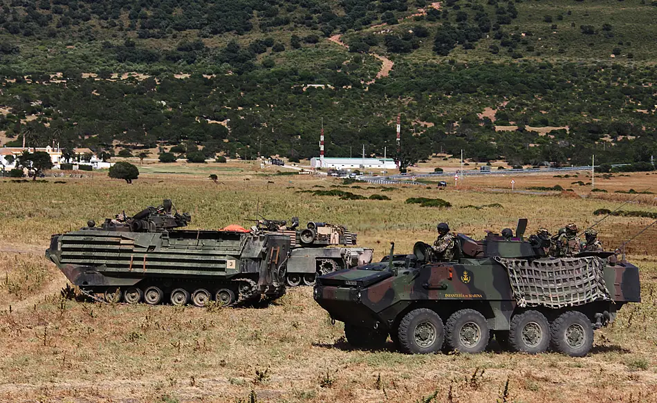 SIERRA DEL RETIN, Spain (June 23, 2011) A Spanish Piranha, right, from 9th Mechanized Company, 3rd Mechanized Landing Battalion, passes by an amphibious assault vehicle assigned to Easy Company, Battalion Landing Team, 2nd Battalion, 2nd Marine Regiment, 22nd Marine Expeditionary Unit, during a mechanized raid. The training is part of the Spanish Amphibious Bilateral Exercise, a 10-day exercise intended to increase interoperability between U.S. and Spanish marines. (U.S. Marine Corps photo by Cpl. Dwight Henderson)