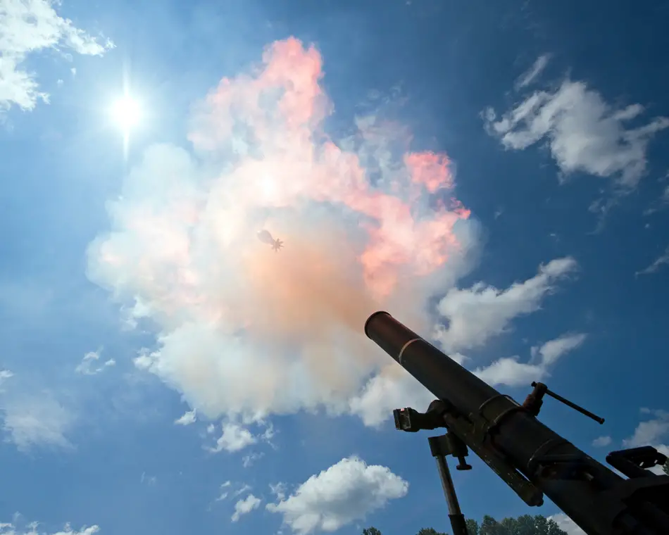 A 120mm mortar leaves the tube, fired by Soldiers of Headquarters and Headquarters Company, 1st Battalion, 293rd Infantry Regiment headquartered in Fort Wayne, Ind., fire 120mm mortars at Camp Atterbury, Ind., July 13. Photo by John Crosby, Atterbury-Muscatatuck Public Affairs
