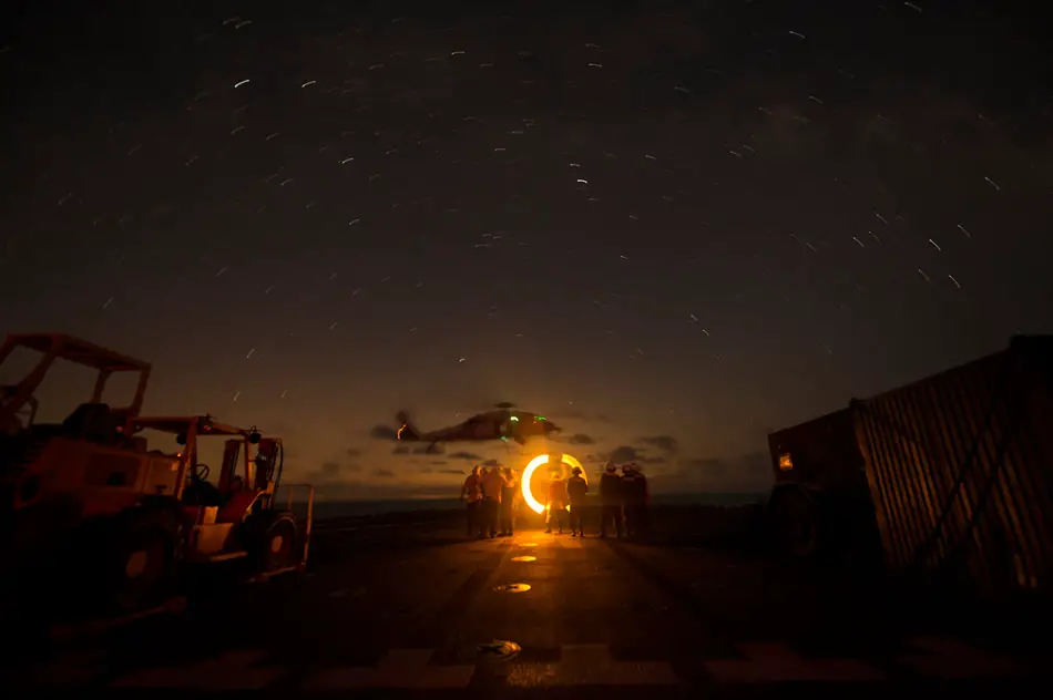 PACIFIC OCEAN (July 29, 2013) Sailors stand ready as a MH-60 Sea Hawk helicopter participates in a dock landing qualification on the flight deck of amphibious dock landing ship USS Harpers Ferry (LSD 49). Harpers Ferry, part of the Boxer Amphibious Ready Group (ARG), is underway off the coast of southern California completing a certification exercise (CERTEX). CERTEX is the final evaluation of the 13th Marine Expeditionary Unit (13th MEU) and Boxer ARG prior to deployment and is intended to certify their readiness to conduct integrated missions across the full spectrum of military operations. (U.S. Navy photo by Mass Communication Specialist 3rd Class Mark El-Rayes)