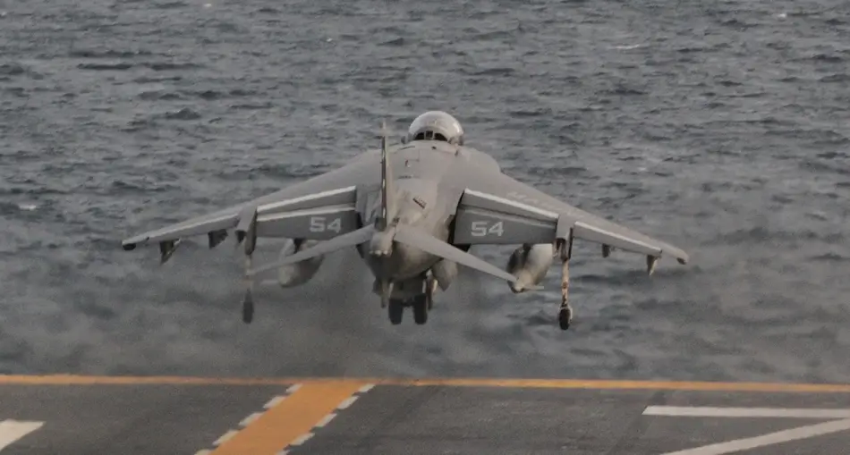 An AV-8B Harrier Jump jet from Marine Medium Tiltrotor Squadron 365 (Reinforced), 24th Marine Expeditionary Unit, takes off from the amphibious assault ship USS Iwo Jima (LHD-7), Jan. 13, 2015. The 24th MEU is embarked on the ships of the Iwo Jima Amphibious Ready Group and deployed to maintain regiaonal security in the U.S. 5th Fleet area of operations (U.S. Marine Corps photo by Lance Cpl. Dani A. Zunun)