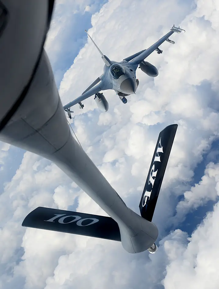 An F-16 Fighting Falcon approaches for air refueling from a KC-135 Stratotanker March 4, 2015, during exercise Iron Hand over southern France. The aircraft were participating in a combined training event designed to enhance interoperability and refine techniques and procedures. (U.S. Air Force photo/Senior Airman Kate Maurer)